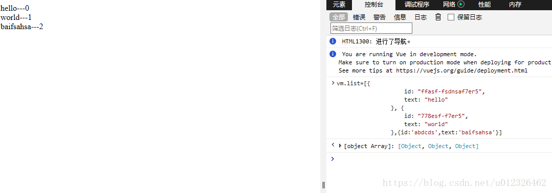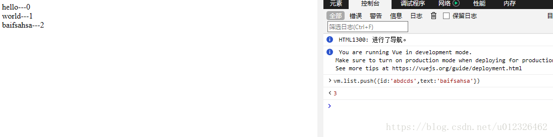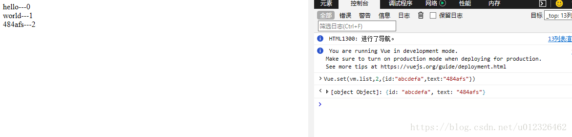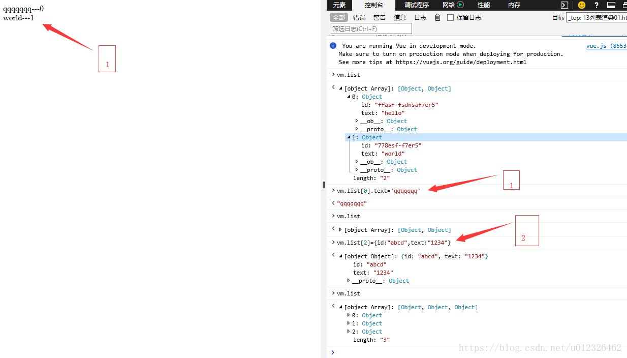 当我们通过下表改变一个对象值的时候,页面渲染跟着变了,可是当我们给数组再增加一个元素时,页面结果并没有改变。
