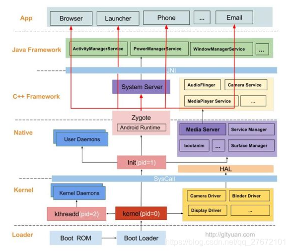 - 引导程序BootLoader:它是在Android操作系统开始运行前的一个小程序,其主要作用是把系统OS拉起来并运行