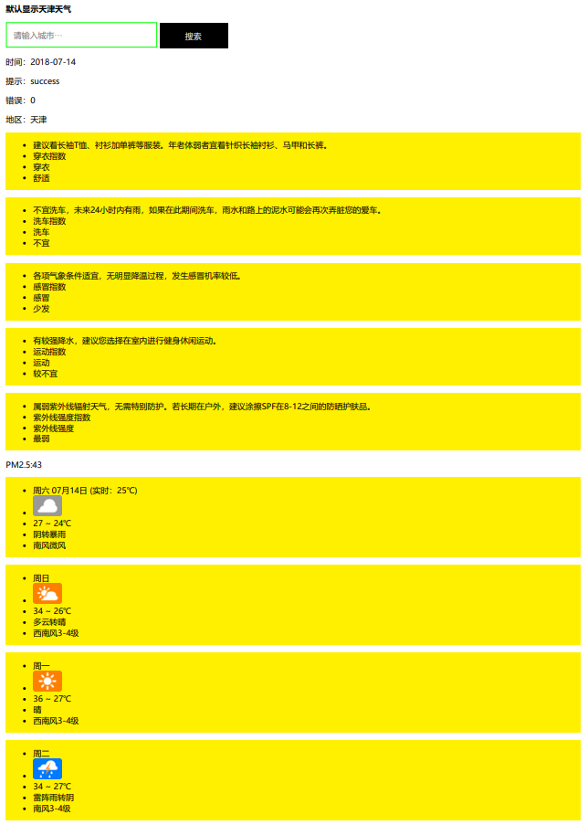 1 <!DOCTYPE html> 2 <html lang="en"> 3 4 <head> 5 <meta charset="UTF-8"> 6 <meta name="viewport" content="width=device-width, initial-scale=1.0"> 7 <meta http-equiv="X-UA-Compatible" content="ie=edge"> 8 <title>百度天气</title> 9 </head> 10 11 <style> 12 ul { 13 background-color: #fff000; 14 padding: 10px 40px; 15 } 16 17 #city { 18 padding: 10px; 19 width: 200px; 20 height: 15px; 21 border: 1px solid #00ff00; 22 } 23 24 #search { 25 height: 37px; 26 background-color: #000; 27 color: #fff; 28 border: 0; 29 width: 100px; 30 vertical-align: middle; 31 } 32 33 #search:hover { 34 background-color: #00ff00; 35 color: #ff6600; 36 } 37 </style> 38 39 <body> 40 <h3>默认显示天津天气</h3> 41 <form action="" onsubmit="return false;"> 42 <input type="text" name="" id="city" placeholder="请输入城市···"> 43 <input type="submit" value="搜索" id="search"> 44 </form> 45 46 <div id="weather"> 47 48 <p>时间:{{ weatherData.date }}</p> 49 50 <p>提示:{{ weatherData.status }}</p> 51 52 <p>错误:{{ weatherData.error }}</p> 53 54 <div v-for="(item) in weatherData.results"> 55 56 <p>地区:{{ item.currentCity }}</p> 57 58 <ul v-for="(item) in item.index"> 59 <li>{{ item.des }}</li> 60 <li>{{ item.tipt }}</li> 61 <li>{{ item.title }}</li> 62 <li>{{ item.zs }}</li> 63 </ul> 64 65 <p>PM2.5:{{ item.pm25 }}</p> 66 67 <ul v-for="(item) in item.weather_data"> 68 <li>{{ item.date }}</li> 69 <li> 70 <img v-bind:src="item.dayPictureUrl" alt=""> 71 </li> 72 <li>{{ item.temperature }}</li> 73 <li>{{ item.weather }}</li> 74 <li>{{ item.wind }}</li> 75 </ul> 76 77 </div> 78 79 </div> 80 81 <script src="http://libs.baidu.com/jquery/1.11.3/jquery.min.js"></script> 82 <script src="https://cdn.jsdelivr.net/npm/vue/dist/vue.js"></script> 83 <script src="weather.js"></script> 84 85 </body> 86 87 </html>