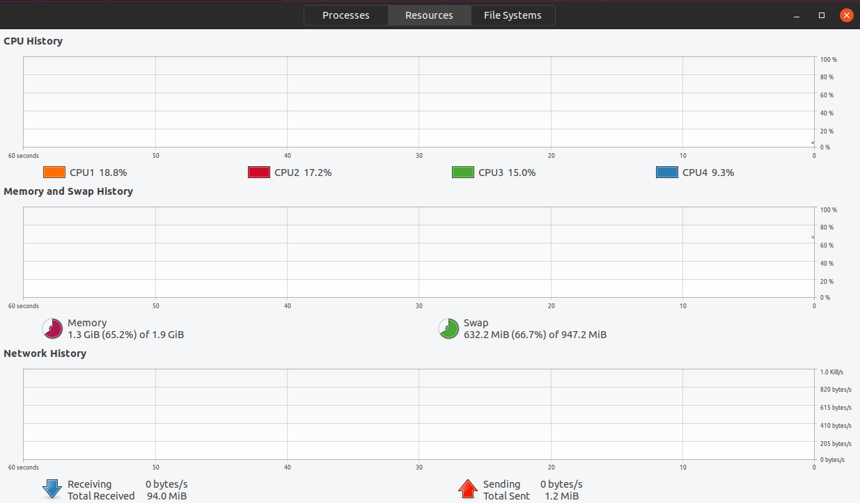 系统自带一个小软件gnome-system-monitor显示系统资源的使用情况CPU ,内存,网络。