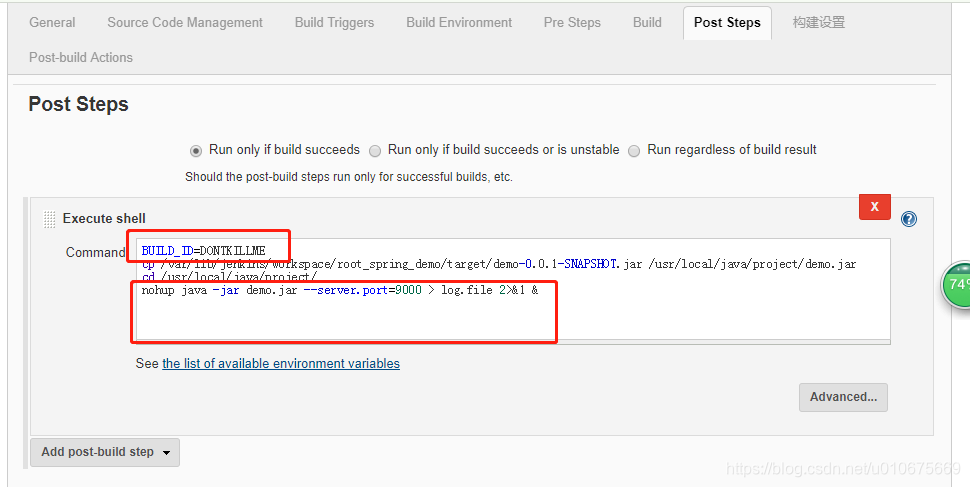 Execute shell Command 加上参数BUILD_ID=DONTKILLME(别杀我,哈哈哈)BUILD_ID=DONTKILLMEcp /var/lib/jenkins/workspace/root_spring_demo/target/demo-0.0.1-SNAPSHOT.jar /usr/local/java/project/demo.jarcd /usr/loc...