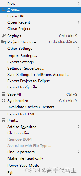 将zip文件解压,在idea中点击file->Open,选择解压后的Ruoyi文件夹,导入项目: