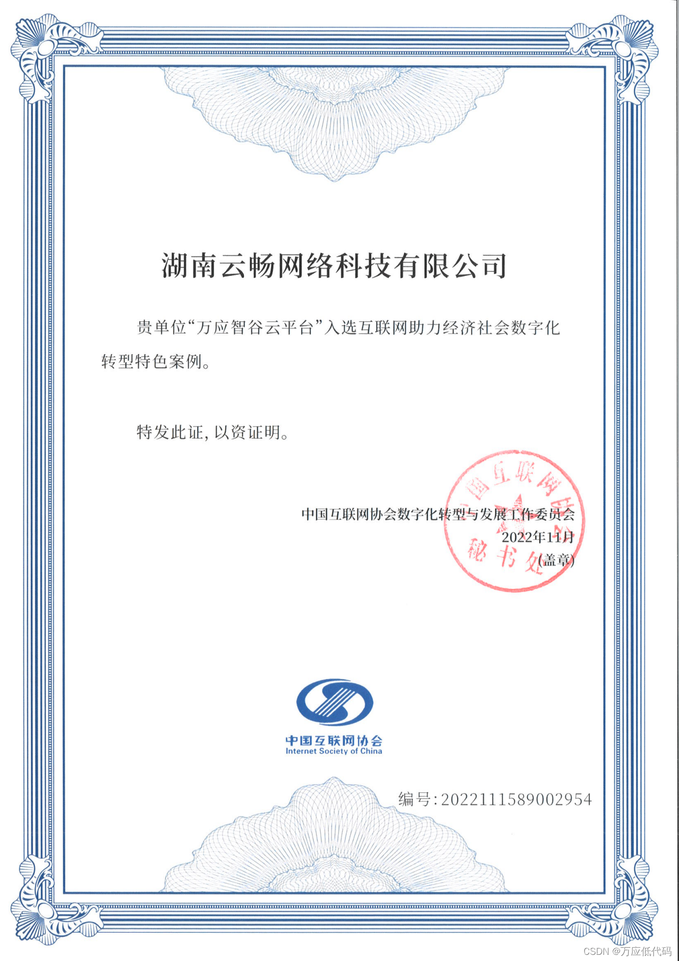实力领航!万应智谷云平台成功入选2022中国互联网大会“互联网助力经济社会数字化转型”特色案例