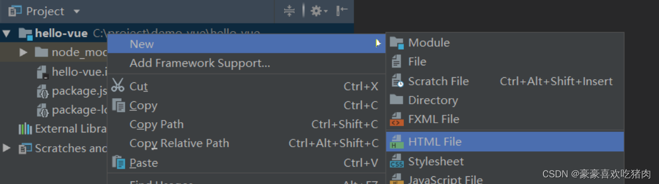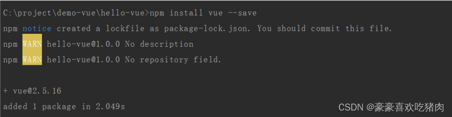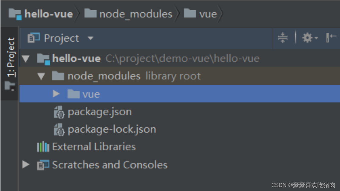 然后就会在 hello-vue 目录发现一个 node_modules 目录,并且在下面有一个 vue 目录。