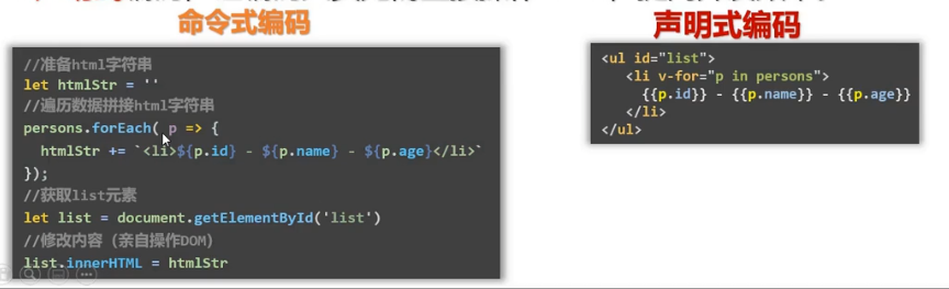 对比命令式编码,首先要getElementById,然后再把处理完的字符串通过list.innerHTML更新上去