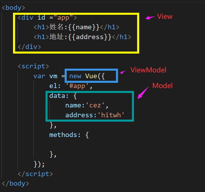 - 创建一个Vue实例或”ViewModel”,它用于连接View和Model。ViewModel是Vue.js的核心,它是一个Vue实例。Vue实例是作用于某一个HTML元素上的,如指定了id=xxx的某个元素。