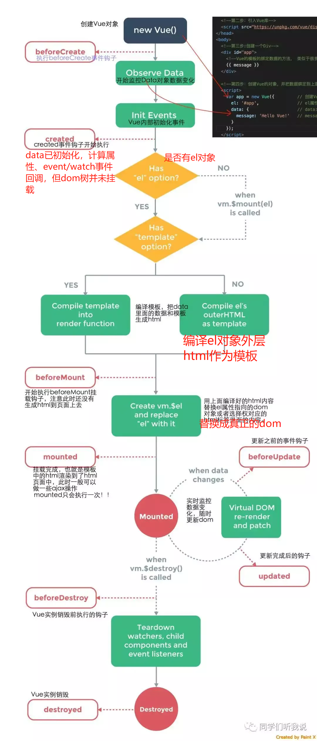 el属性指向View,el: ‘#app’表示该Vue实例将挂载到<div id="app">...</div>这个元素