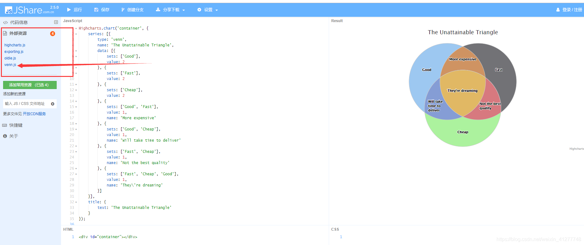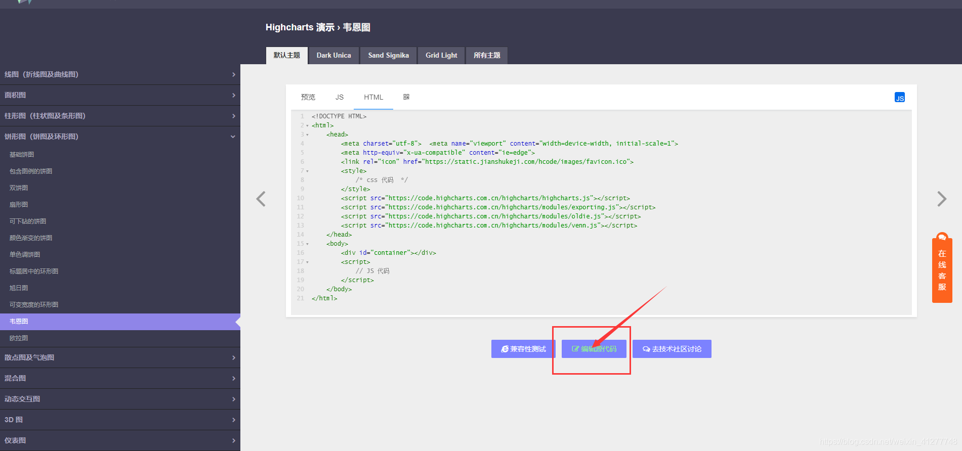 8、你找到韦恩图的实例选择编辑源代码,然后你会发现他有一个js是venn.js,那么我是不是就可以当如这个venn.js就可以使用了