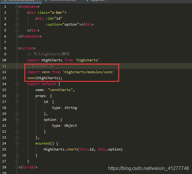 5、网上找了半天都没有说这个怎么解决,然后自己琢磨,没有这个venn肯定是缺少了这个venn相关的js,但你不知道该怎么引入,然后你可以去highchartsd 文档中找发现好像也没有https://www.highcharts.com.cn/docs/highcharts-vue 这文档里面你会发现他是怎么导入其他包的,我们就可以想我们韦恩图的js是不是也可以像这样导入,只是不知道有没有这样的js