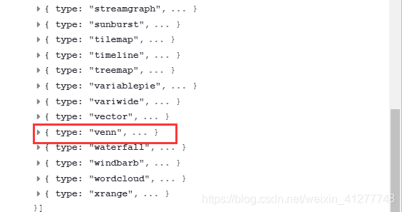 6、然后我就去找highcharts的API文档 然后找到他的series发现并没有文档案例中的venn类型,我想难道没有这玩意吗?