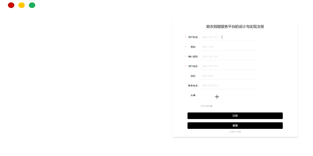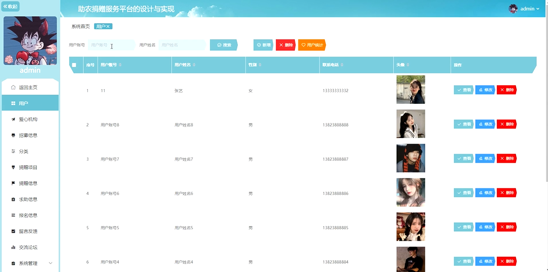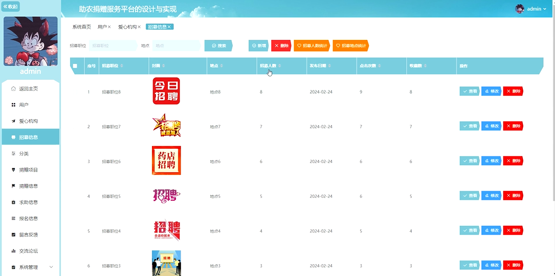 通过本平台能够将用户的信息管理工作规范化、简单化,从而提高管理工作的效率。本论文主要包括用户、爱心机构、招募信息、分类、捐赠项目、捐赠信息、求助信息、报名信息、留言反馈、交流论坛、系统管理、个人资料等功能;在windows10的平台环境下,采用的编程语言为java和springboot框架,将mysql作为后台数据库来实现助农捐赠管理流程中的各种需求。