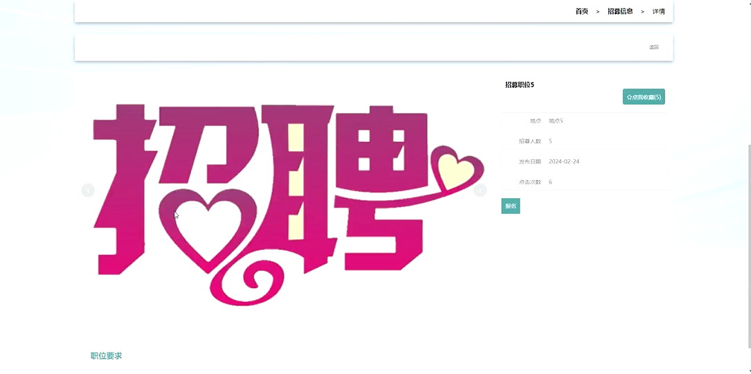 招募信息:在招募信息页面的输入栏中输入招募职位或地点进行查询,可以查看到招募详细信息;并根据需要进行收藏或报名等操作;招募信息页面如图5-3所示: