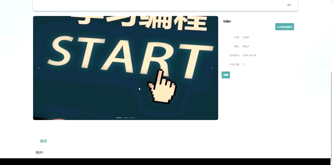 捐赠项目:在捐赠项目页面的输入栏中输入标题进行查询,可以查看到捐赠项目详细信息,并根据需要进行收藏或捐赠等操作;捐赠项目页面如图5-4所示: