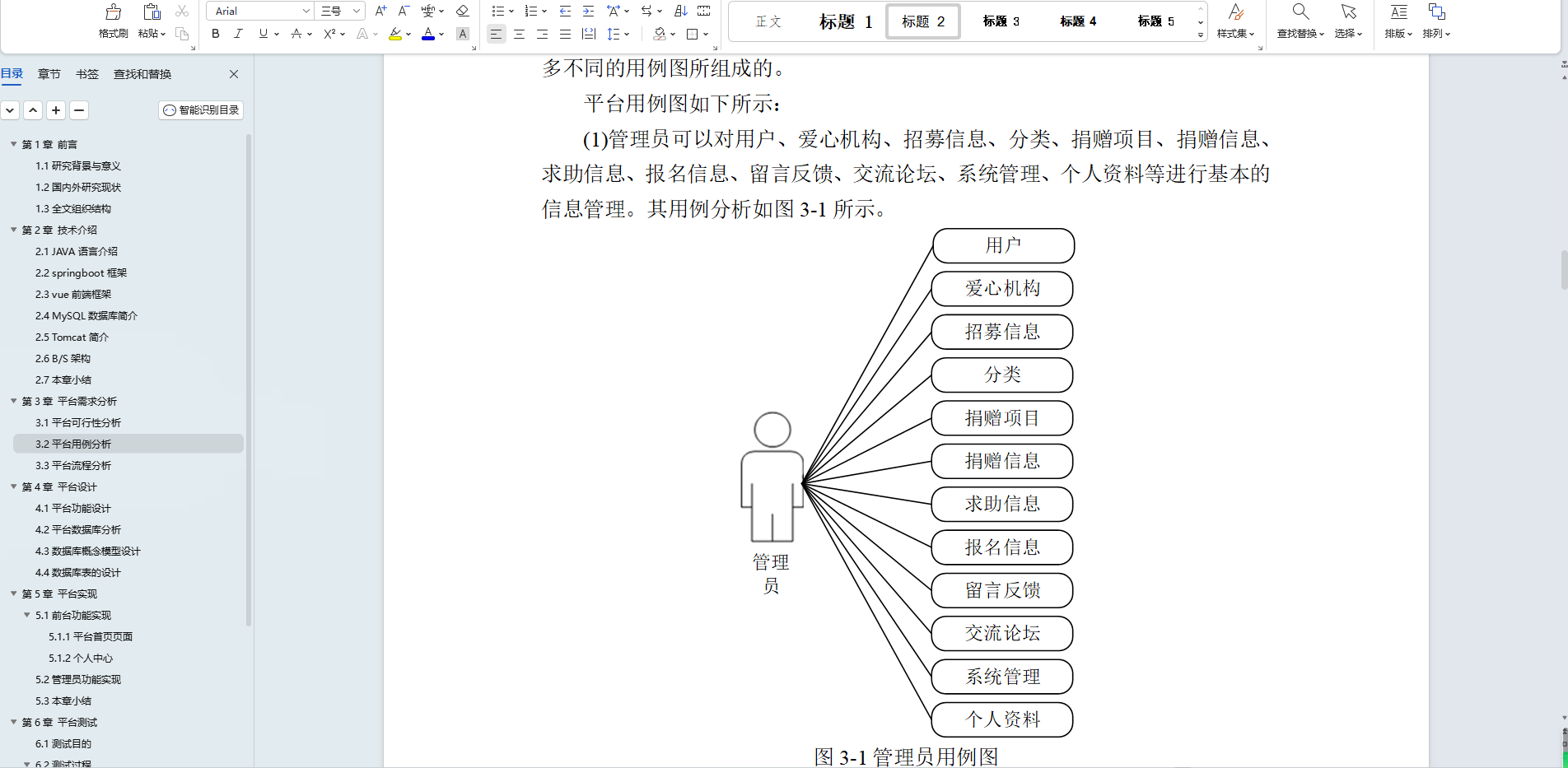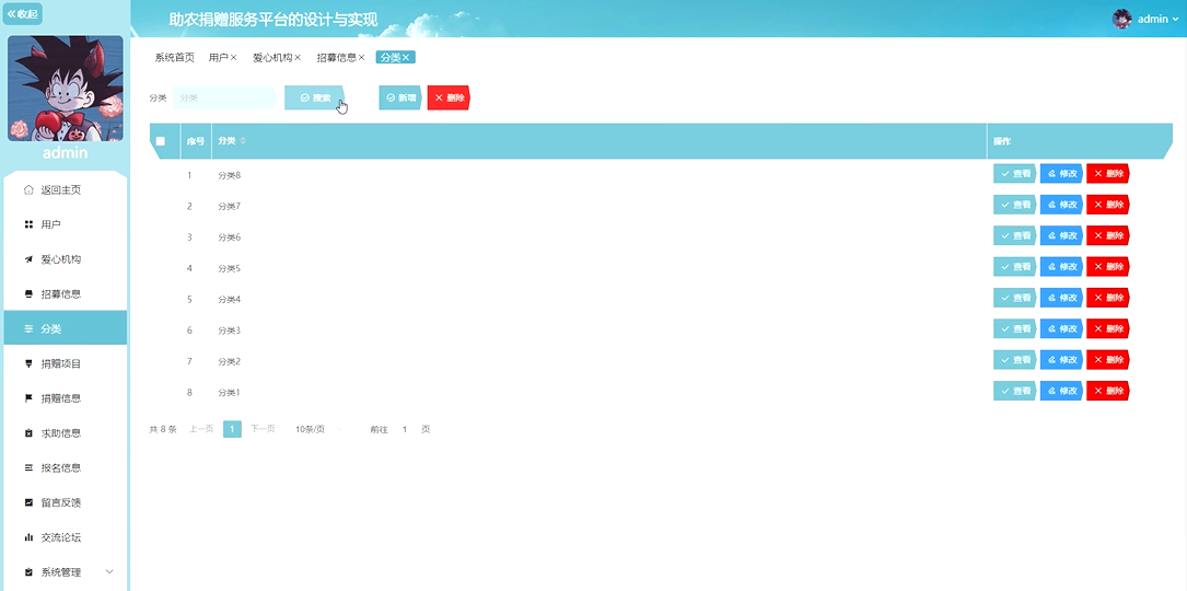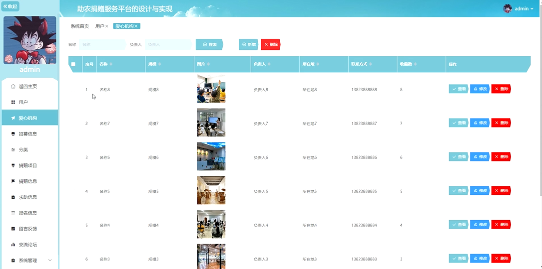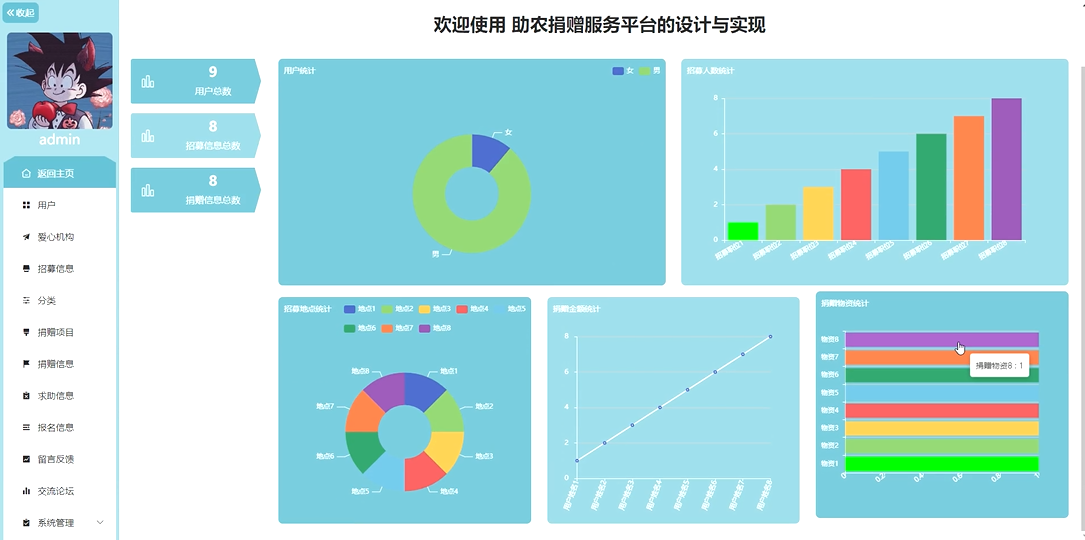 管理员进入主页面,主要功能包括对用户、爱心机构、招募信息、分类、捐赠项目、捐赠信息、求助信息、报名信息、留言反馈、交流论坛、系统管理、个人资料等进行操作。管理员主页面如图5-7所示: