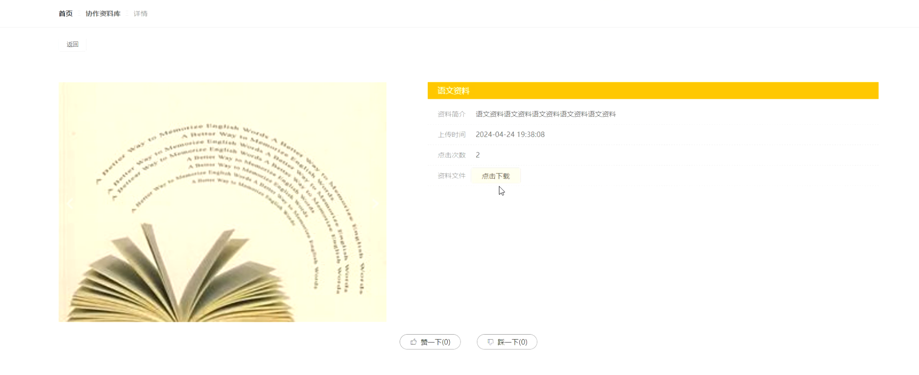 协作资料库:在协作资料库页面的输入栏中输入资料名称进行查询,可以查看到协作资料库详细信息,并进行点赞、评论或下载操作;协作资料库页面如图5-3所示: