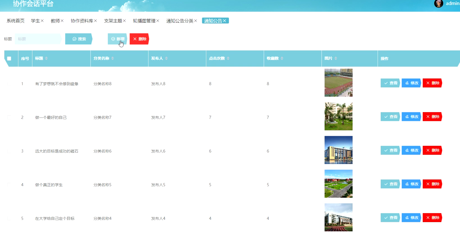 管理员点击通知公告。进入通知公告页面输入标题进行搜索、新增或删除通知公告详细信息。并进行查看、修改或删除操作。如图5-11所示: