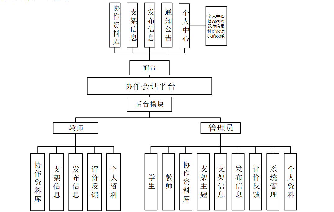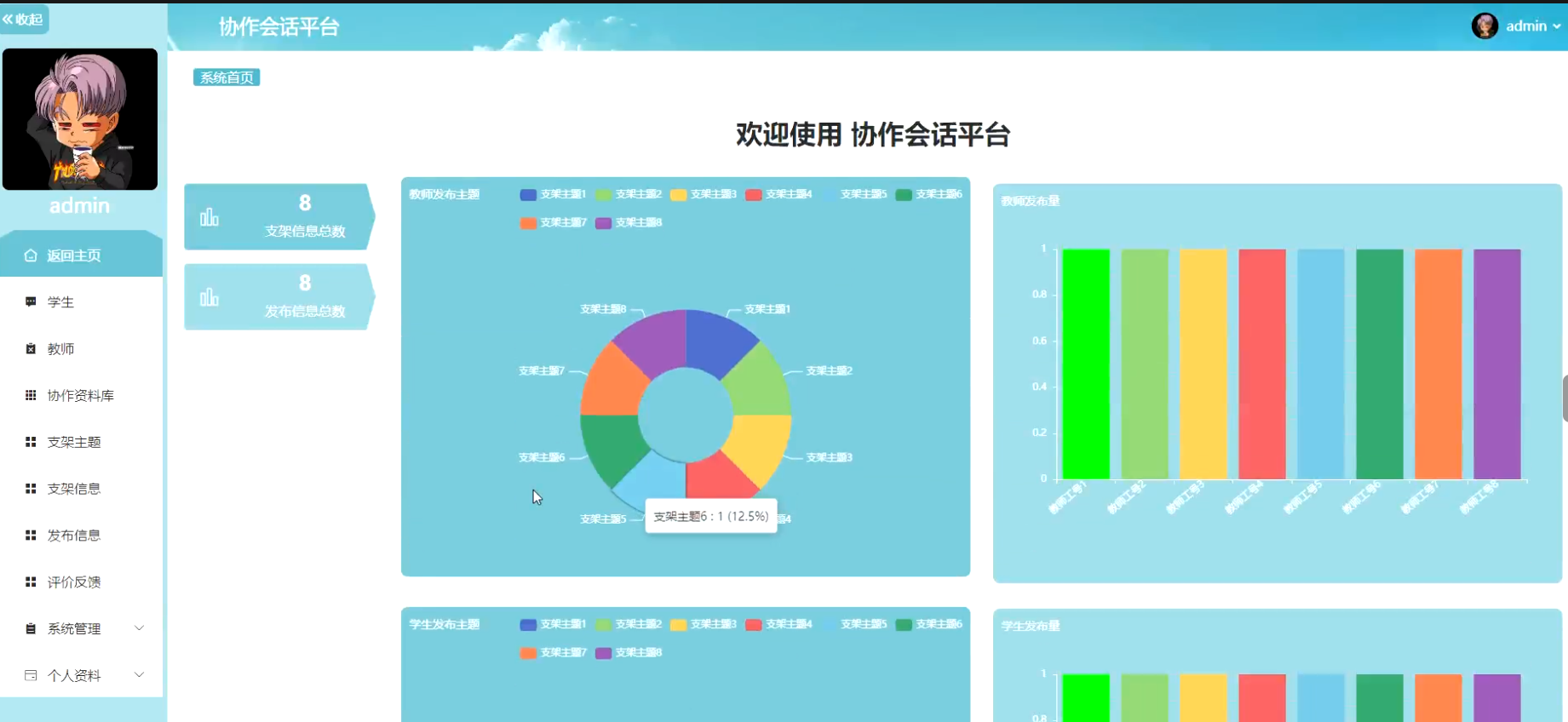 管理员进入主页面,主要功能包括对学生、教师、协作资料库、支架主题、支架信息、发布信息、评价反馈、系统管理、个人资料等进行操作。管理员主页面如图5-6所示:
