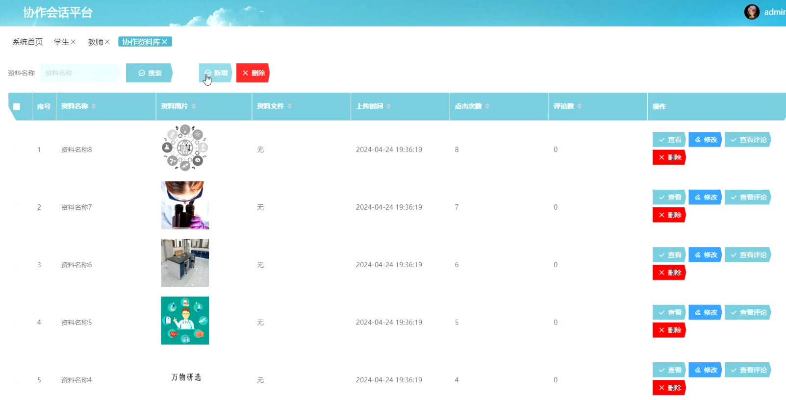 管理员点击协作资料库。进入协作资料库页面输入资料名称进行搜索、新增或删除协作资料库详细信息。并进行查看、修改、查看评论或删除操作。如图5-9所示: