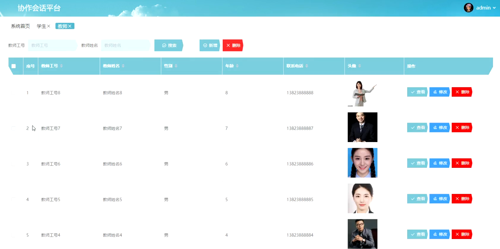 教师功能在视图层(view层)进行交互,比如点击“搜索、新增或删除”按钮或填写教师信息表单。这些教师信息表单动作被视图层捕获并作为请求发送给相应的控制器层(controller层)。控制器接收到这些请求后,调用服务层(service层)以执行相关的业务逻辑,例如验证输入数据的有效性和与数据库的交互。服务层处理完这些逻辑后,进一步与数据访问对象层(DAO层)交互,后者负责具体的数据操作如查看、修改或删除教师信息,并将操作结果返回给控制器。最终,控制器根据这些结果更新视图层,以便教师功能可以看到最新的信息或相应的操作反馈。教师界面如图5-8所示:
