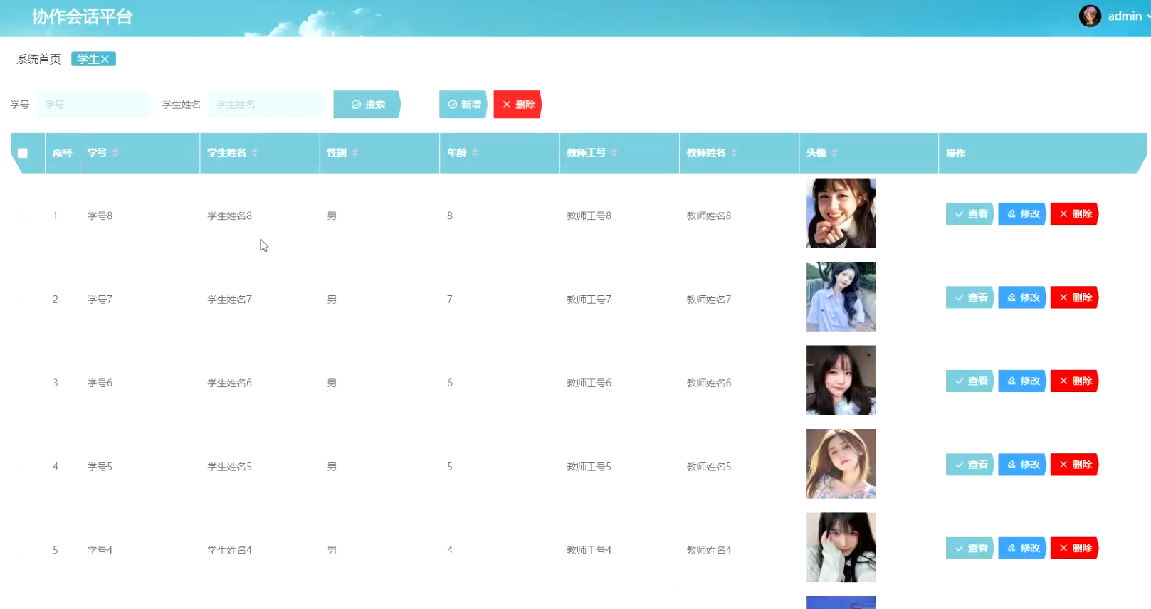学生功能在视图层(view层)进行交互,比如点击“搜索、新增或删除”按钮或填写学生信息表单。这些学生表单动作被视图层捕获并作为请求发送给相应的控制器层(controller层)。控制器接收到这些请求后,调用服务层(service层)以执行相关的业务逻辑,例如验证输入数据的有效性和与数据库的交互。服务层处理完这些逻辑后,进一步与数据访问对象层(DAO层)交互,后者负责具体的数据操作如查看、修改或删除学生信息,并将操作结果返回给控制器。最终,控制器根据这些结果更新视图层,以便学生功能可以看到最新的信息或相应的操作反馈。学生界面如图5-7所示: