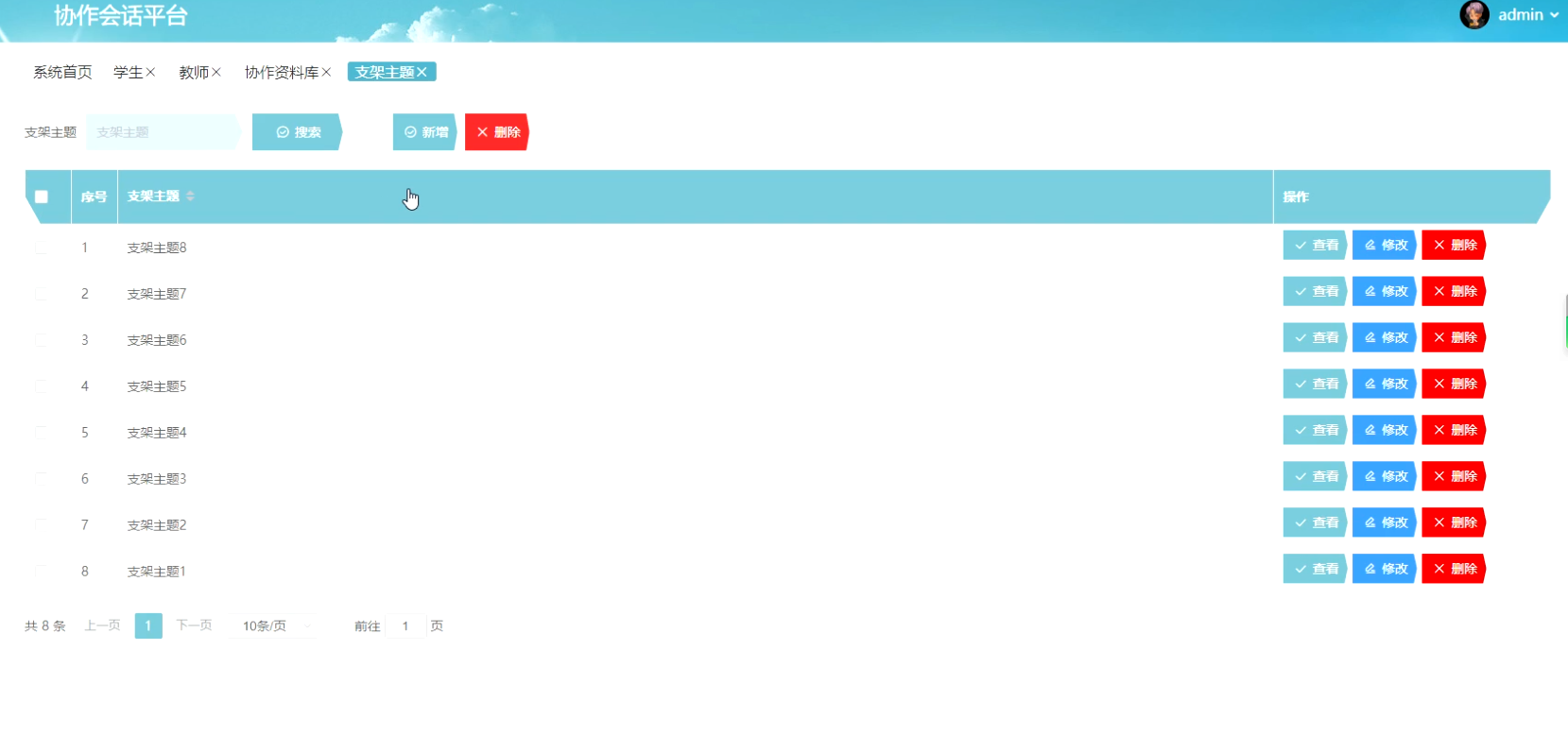 管理员点击支架主题。进入支架主题页面输入支架主题进行搜索、新增或删除支架主题详细信息。并进行查看、修改或删除操作。如图5-10所示: