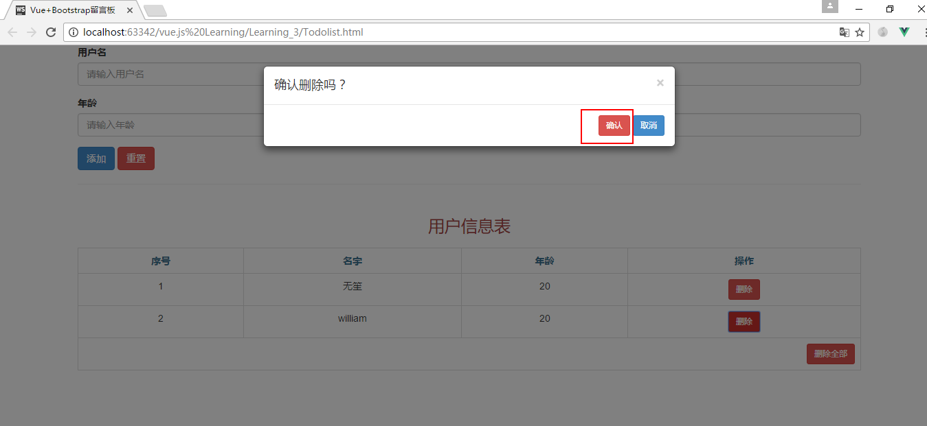 实现留言板效果图添加两个信息接下来删除william这条信息接着弹出模态框,提示是否删除。最后就是只有无笙的这条信息了接下来就是代码环节。用户名