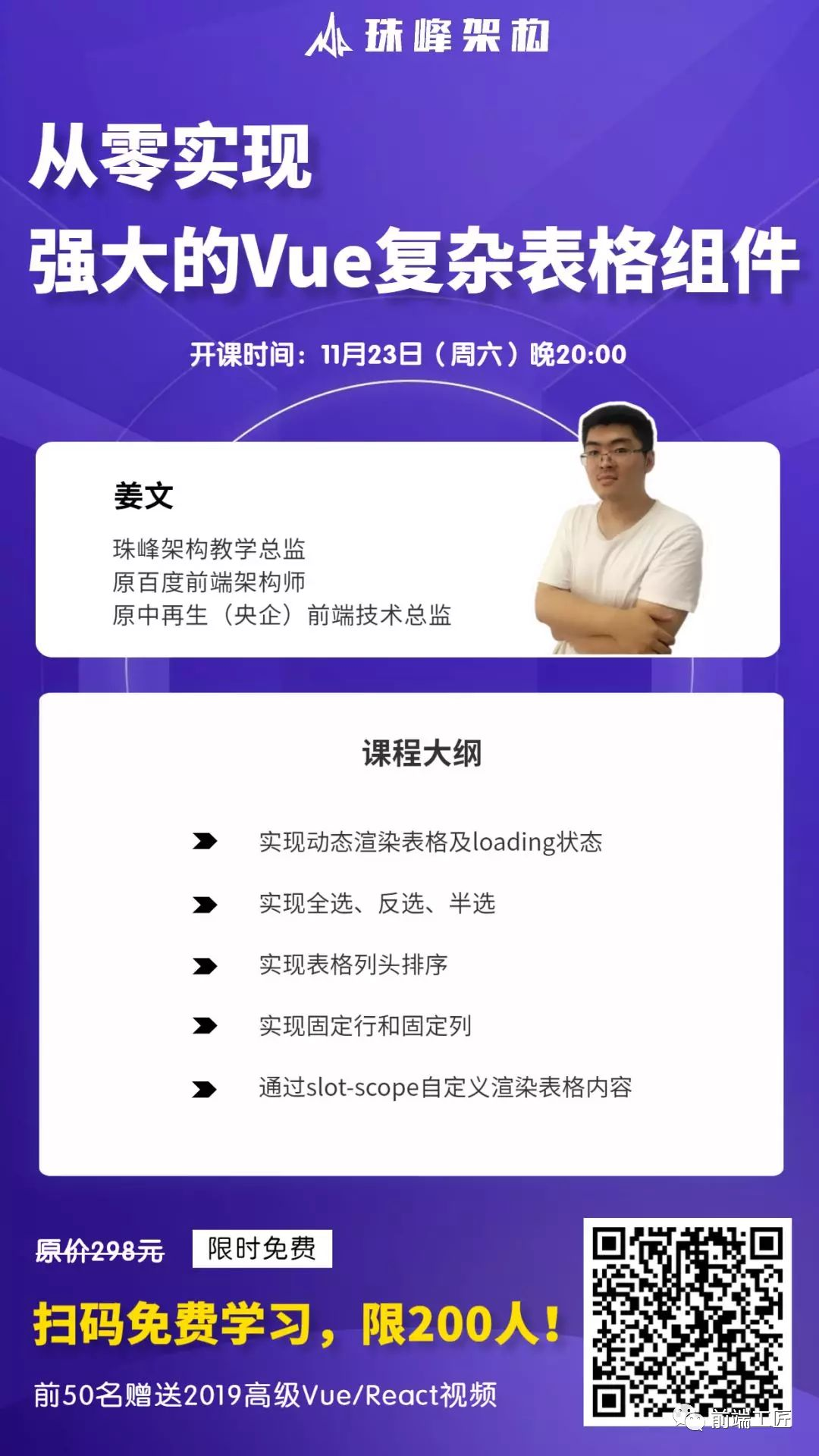对于前端开发者来说,组件化是非常重要的一个思想,其中表格组件是经常会遇到的业务场景,那怎样实现一个高复用,且功能齐全表格组件呢?本周六晚八点,一起从零实现一个强大的Vue...