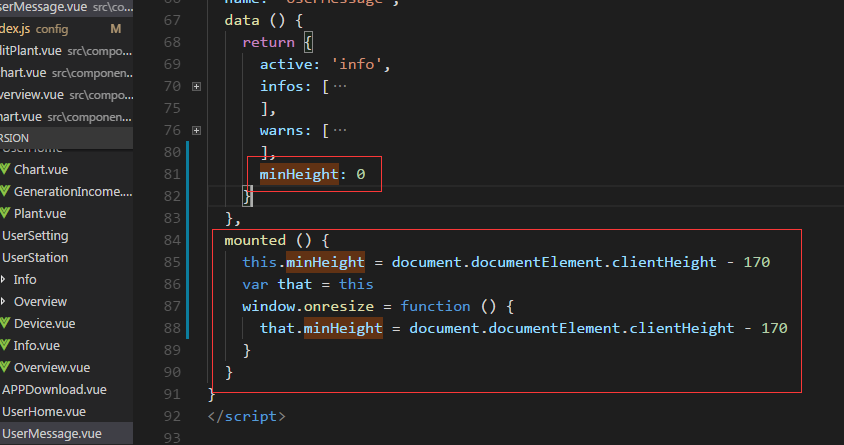 页面第一次mounted()时,计算footer组件兄弟容器user-message的最小高度,其中的170为顶部header加上footer自身的高度,随后给window添加窗口变化事件,回调函数重新计算minHeight的值,template中minHeight发生改变,footer的位置自然也就发生变化。