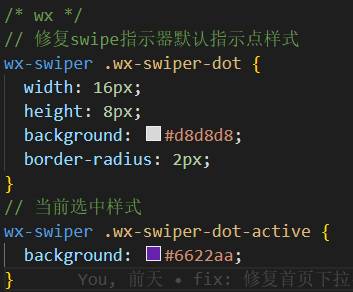 经过h5和小程序dom tree的对比,uni-app框架对swiper组件进行过样式的条件编译,所以在这里我们采取针对小程序样式单独复写的方法,达到修改指示器样式的目的。