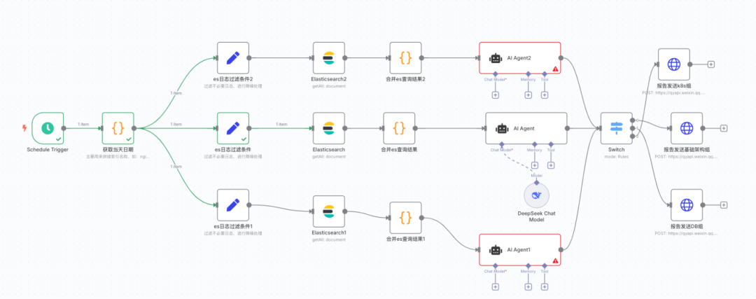 运维同学基本都接触过日志系统,最熟悉的应该就是代表性的ELK日志系统,作为日志查询的利器,我想大多数人也只有在排查问题时,才会登陆日志系统去搜索错误日志,平时肯定也懒得主动去看,去分析系统有哪些潜在的风险提示。实际看上去风平浪静,实则暗流涌动,结合上篇文章介绍的n8n工作流编排工具,我想着再把ES日志接入AI,来分析下,想看看,在平时注意不到的地方,到底还有什么隐藏故障,如下是运行后的效果图: