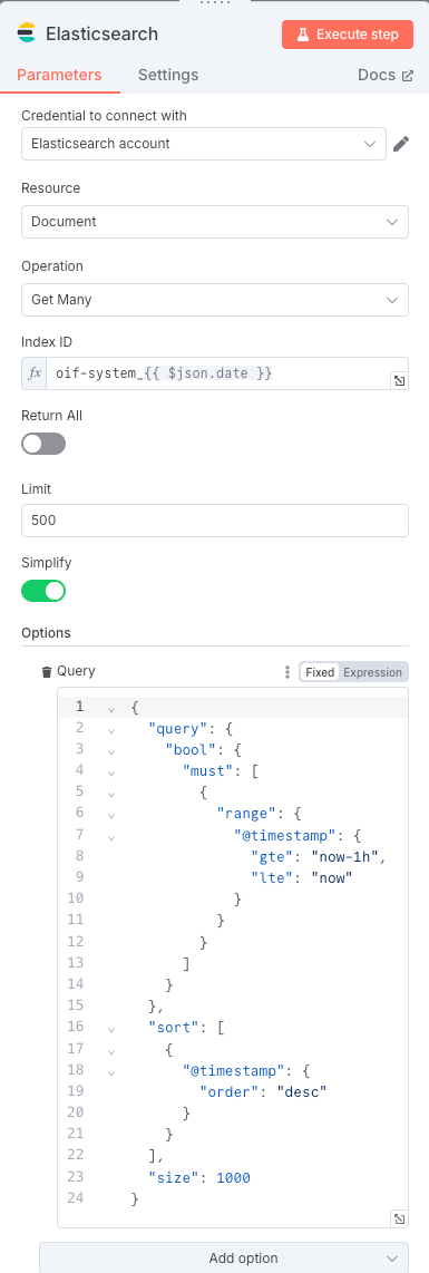 开头节点是定时器,定义每小时执行1次,即每小时查询es最新1小内的日志,这个很简单,不用多说。