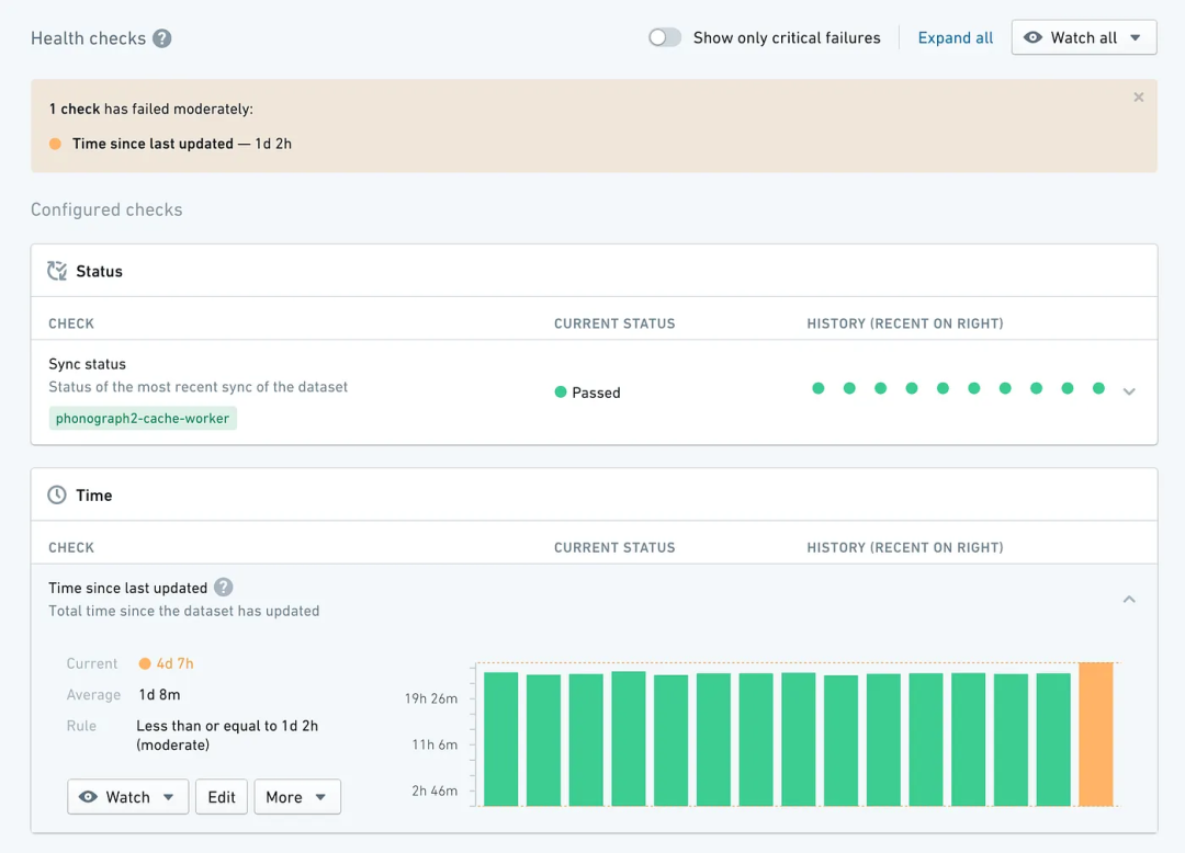 - Data Health:你可以为数据设置全方位的“健康检查”。这些检查可以基于各种标准,如状态(status)、时间(time)、大小(size)、内容(content)、模式(schema)等。一旦数据出现异常(例如,某个关键数据集超过 24 小时未更新),系统就会根据预设的严重性级别触发警报。