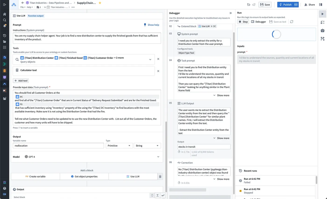 - 编写提示:我们用自然语言在 AIP Logic 中输入指令。因为我们已经授权 LLM 访问本体中的特定对象(如“客户订单”),所以我们可以在提示中直接引用它们。