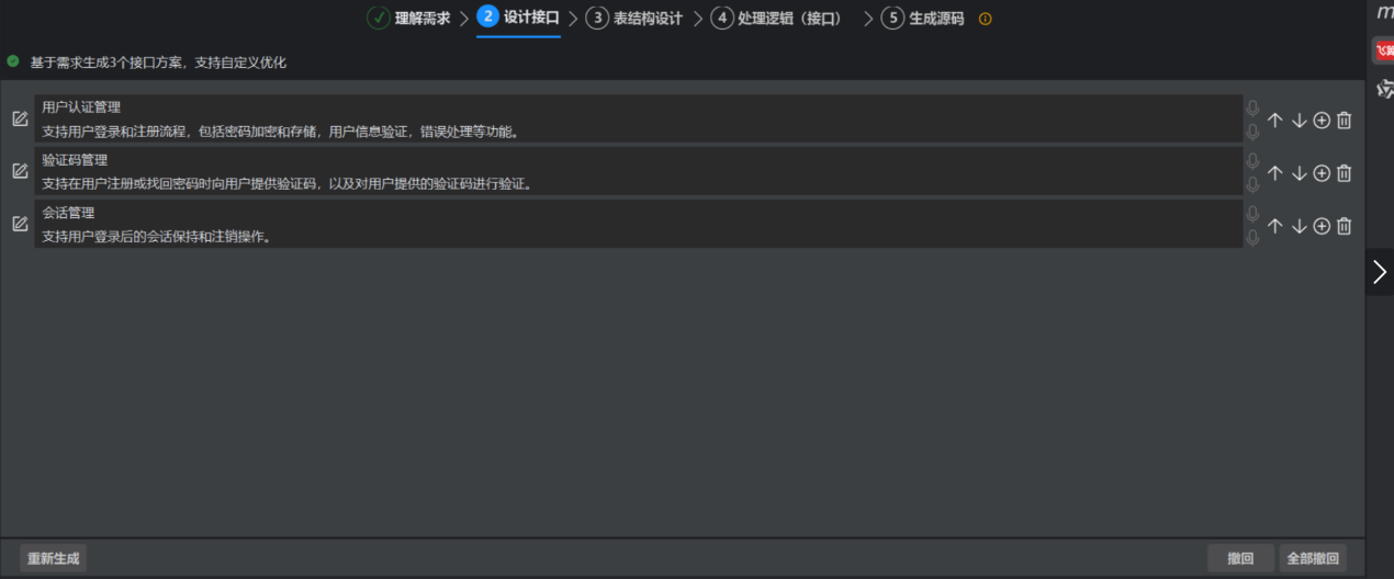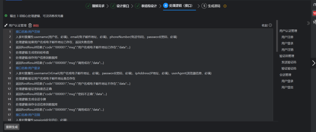 它先基于我的需求,自动划分了3个核心接口模块:用户认证、验证码、会话管理,每个模块的功能说明、请求方式、响应格式都列得明明白白。