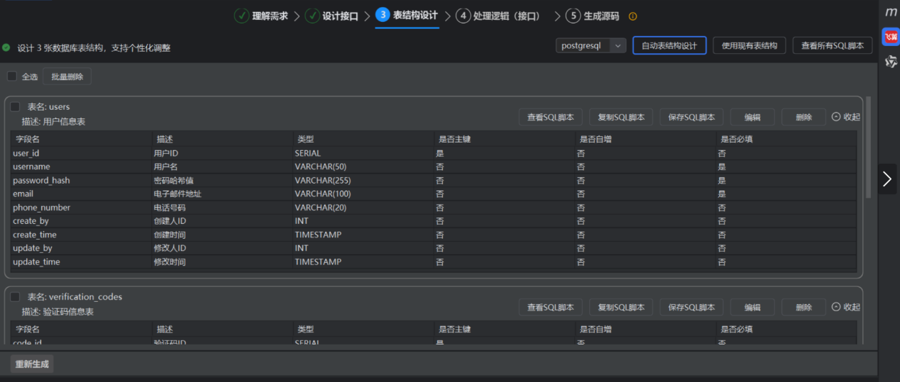 接着生成数据库表结构时,更是超出我的预期。用户表的字段不仅包含了用户名、密码、邮箱这些基础信息,还加了“修改人ID”“状态标识”“最后登录时间”这些符合工程规范的必备字段,甚至连字段类型、长度都按数据库设计最佳实践配置好了。