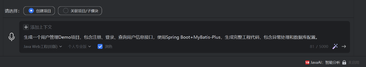但飞算JavaAI专业版的“无限Tokens”是真的“无限制”——不是限时体验,也不是每日配额。我在它的智能引导界面,直接敲了一句完整的需求:“生成一个用户管理Demo项目,包含注册、登录、查询用户信息接口,使用Spring Boot+MyBatis-Plus,生成完整工程代码,包含异常处理、数据库配置,还要有密码加密和验证码校验功能”。
