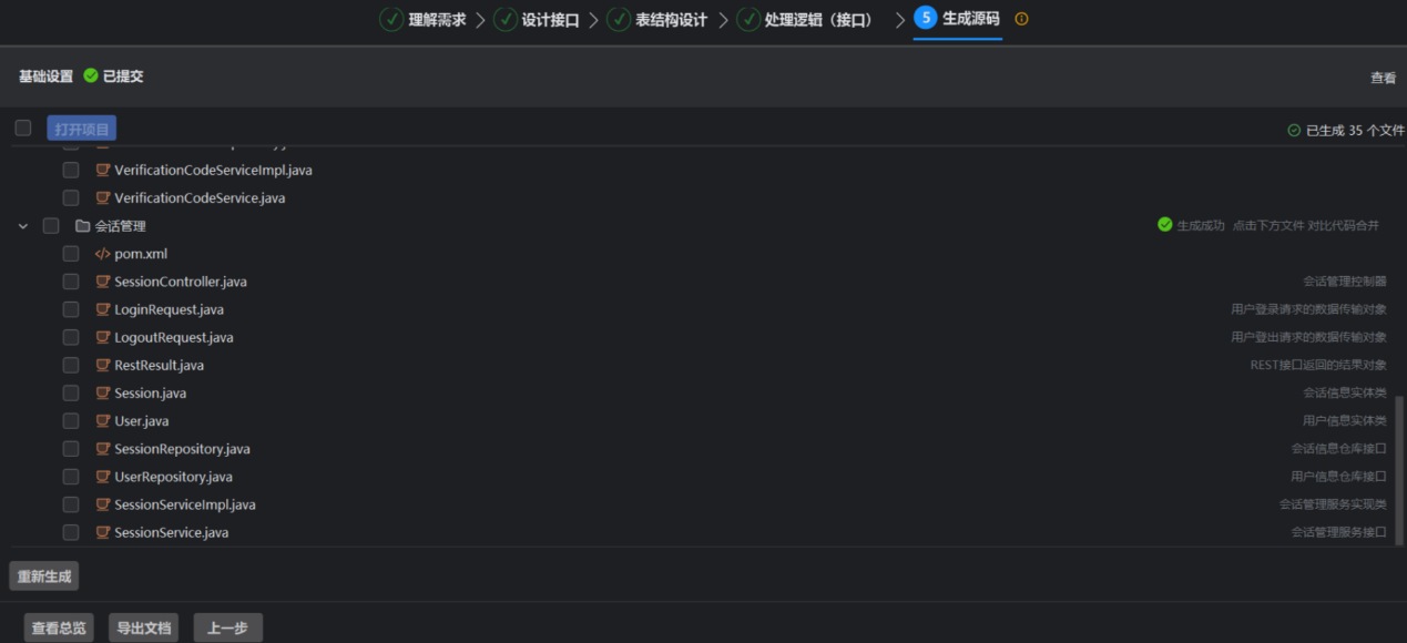 等智能引导走完“需求拆解-接口设计-表结构设计-处理逻辑”全流程,我点击“生成源码”,不到3分钟,系统就输出了35个文件——从Controller、Service、Dao层到实体类、全局异常处理器、数据库配置文件,一个没少。
