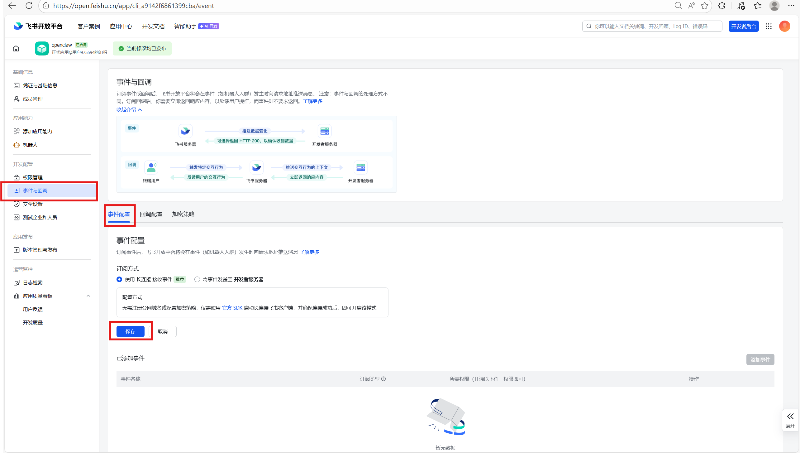 回到飞书开放平台,在页面左侧找到事件与回调,选择订阅方式,保存长链接