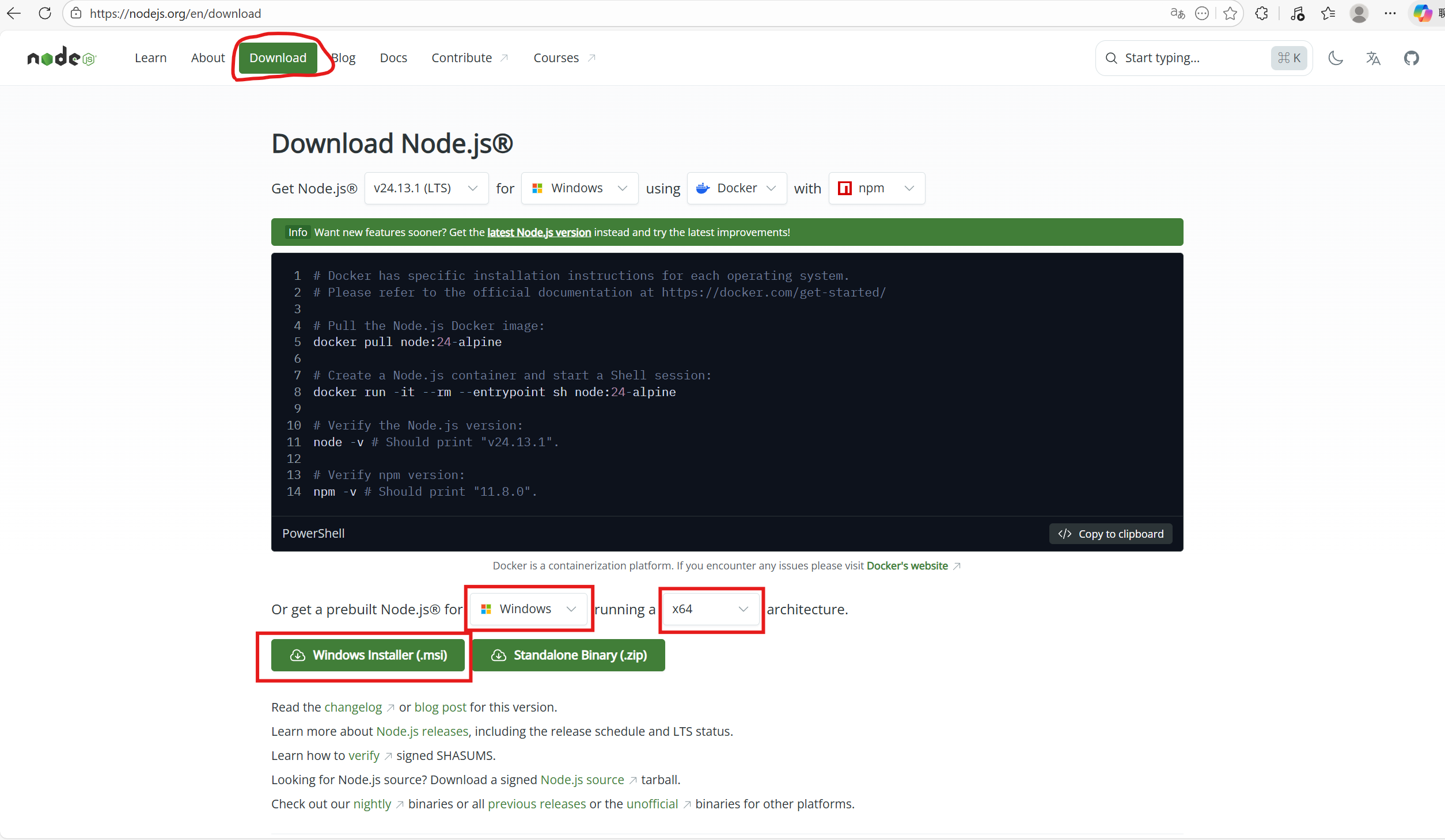 https://nodejs.org/en,选择Download,并在下方根据你的电脑系统进行下载