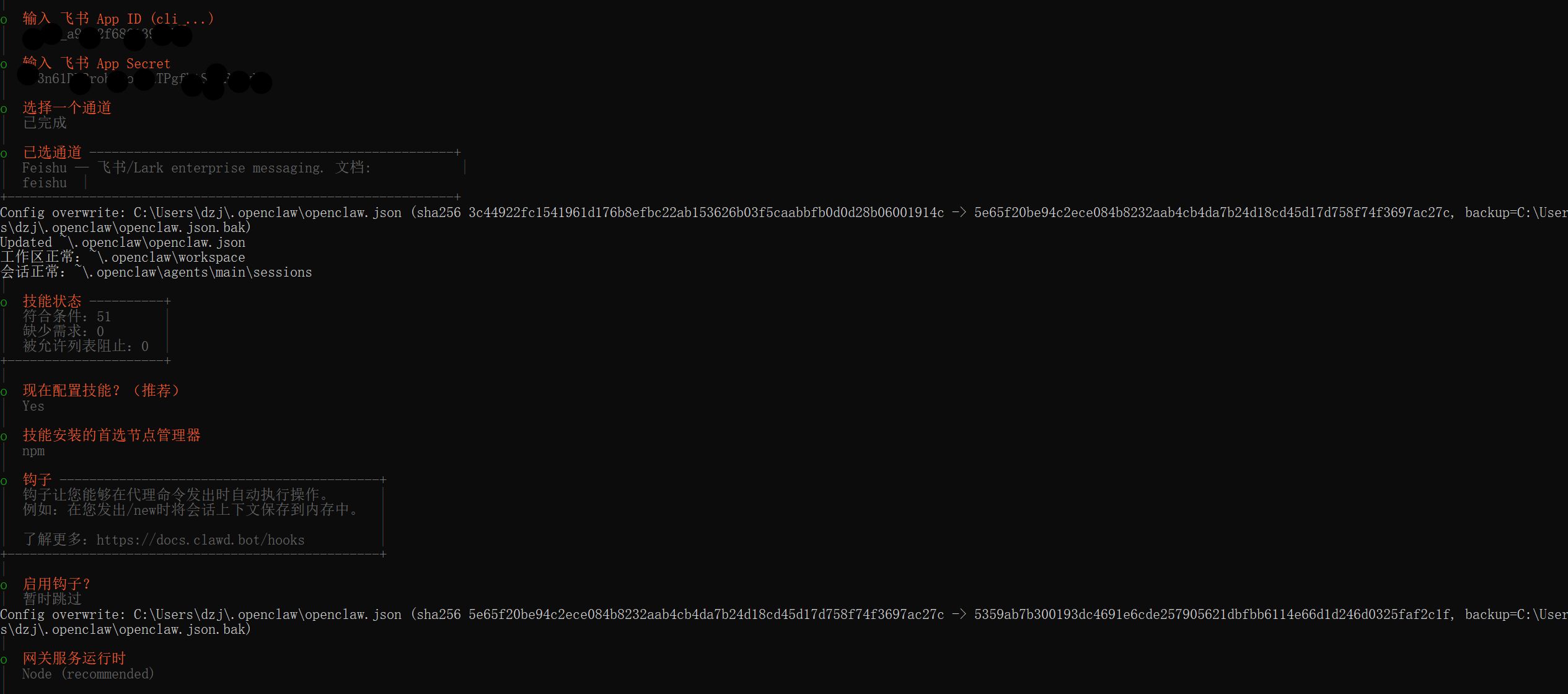 接着需要输入App Secret,把刚才飞书页面的App Secret再复制粘贴到命令行中并回车