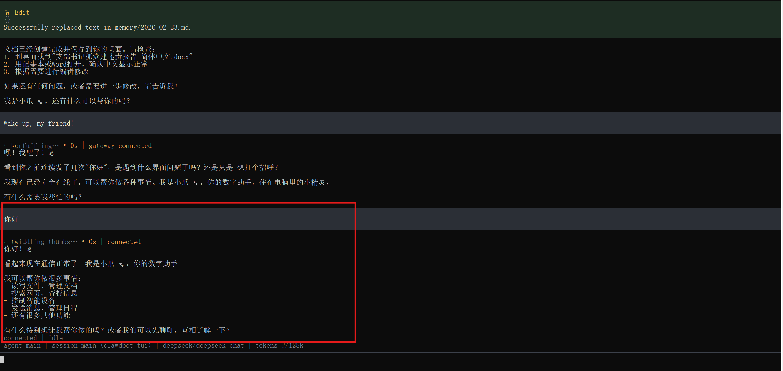 这里注意!!!如果你的机器人对话没反应,说明你的deepseek账号没有token,我们只要回到