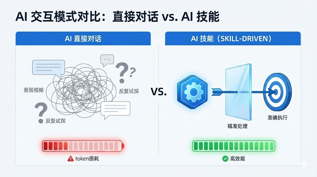 相比于跟AI直接对话,Skills可以让AI更好的理解我们的真实意图,并且按照这个Skills的来执行,减少无意义token的消耗。