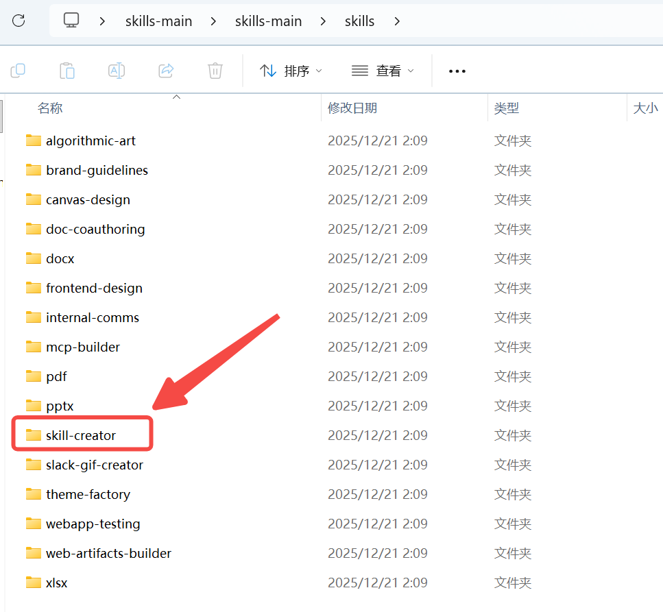 按照我们第2种方法介绍,直接将这些Skills放到~.claude\skills下面即可,其中这个Skills-creator就是用来生成Skills的。