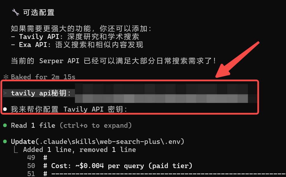 当然如果你能看懂配置文件,直接自己打开配置文件,在对应的位置加上这几个API秘钥也可以,但如果你不懂就全交给Claude,它自己会搞定的。