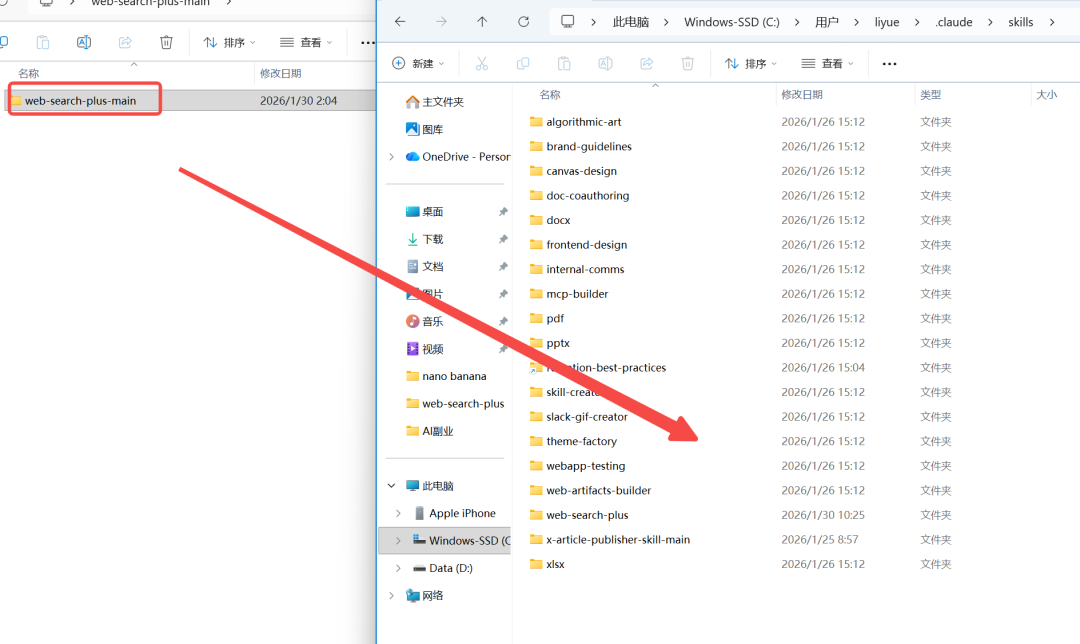 下载完成后解压后,我们将web-search-plus的文件夹拷贝到我们的Skills存放路径下面即可。