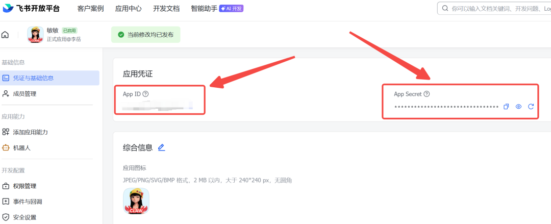 虽然已经给机器人授权了操作文档,但是还是要授权对应的机器人APPID和密钥,这个就是你的应用凭证这里,其实我不说,你的openclaw到时候也会找你要。