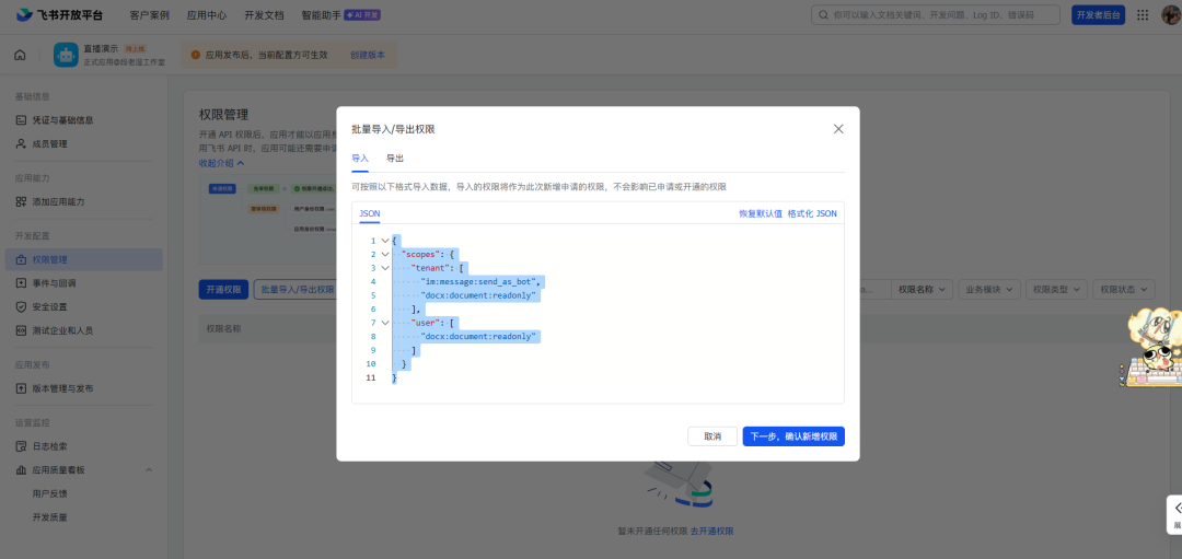 现在需要继续回到飞书开发者后台开通权限