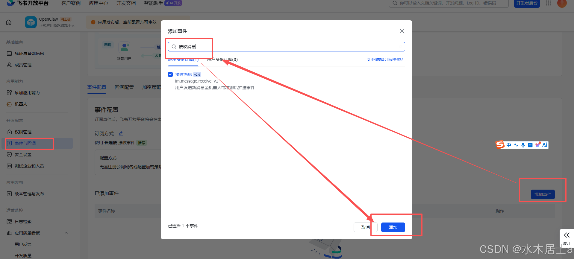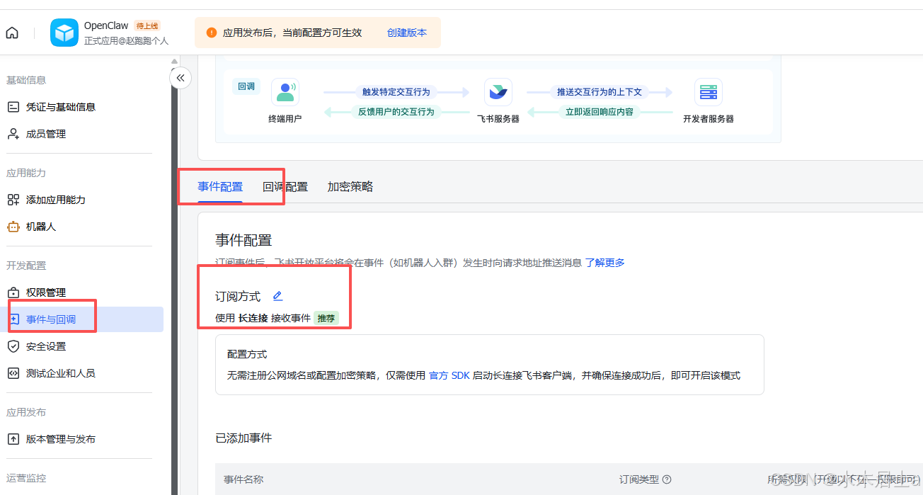 长连接成功之后再去事件与回调-事件配置-点击保存,这次成功!!!