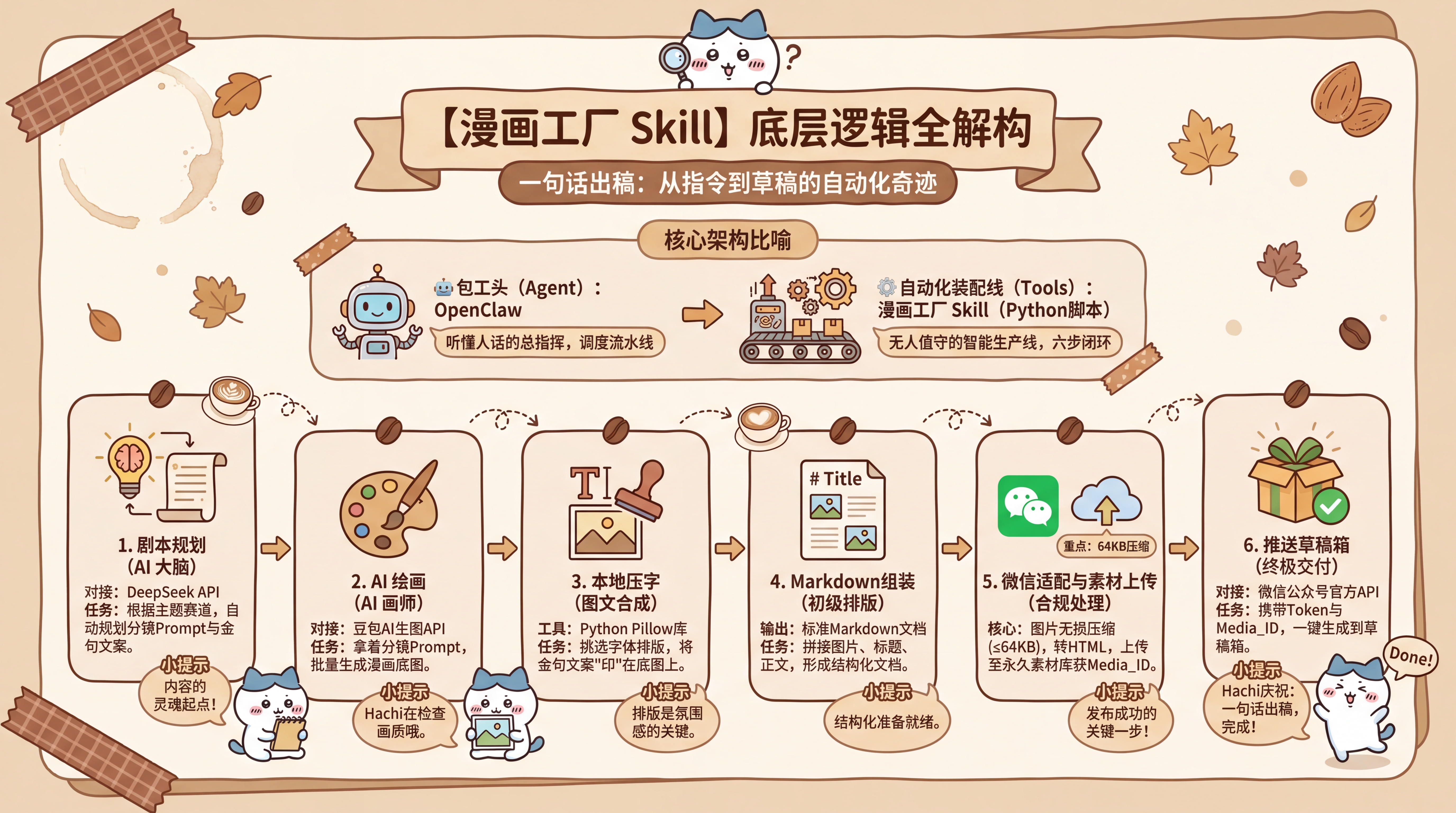 openclaw+漫画工厂skill底层实现逻辑如下图所示。整个架构可以理解为“包工头” + “自动化装配线”。在这里,OpenClaw 就是听得懂人话的“包工头”,而我们用 Python 编写的漫画工厂 Skill 就是高度定制的“装配线”(Tools)。