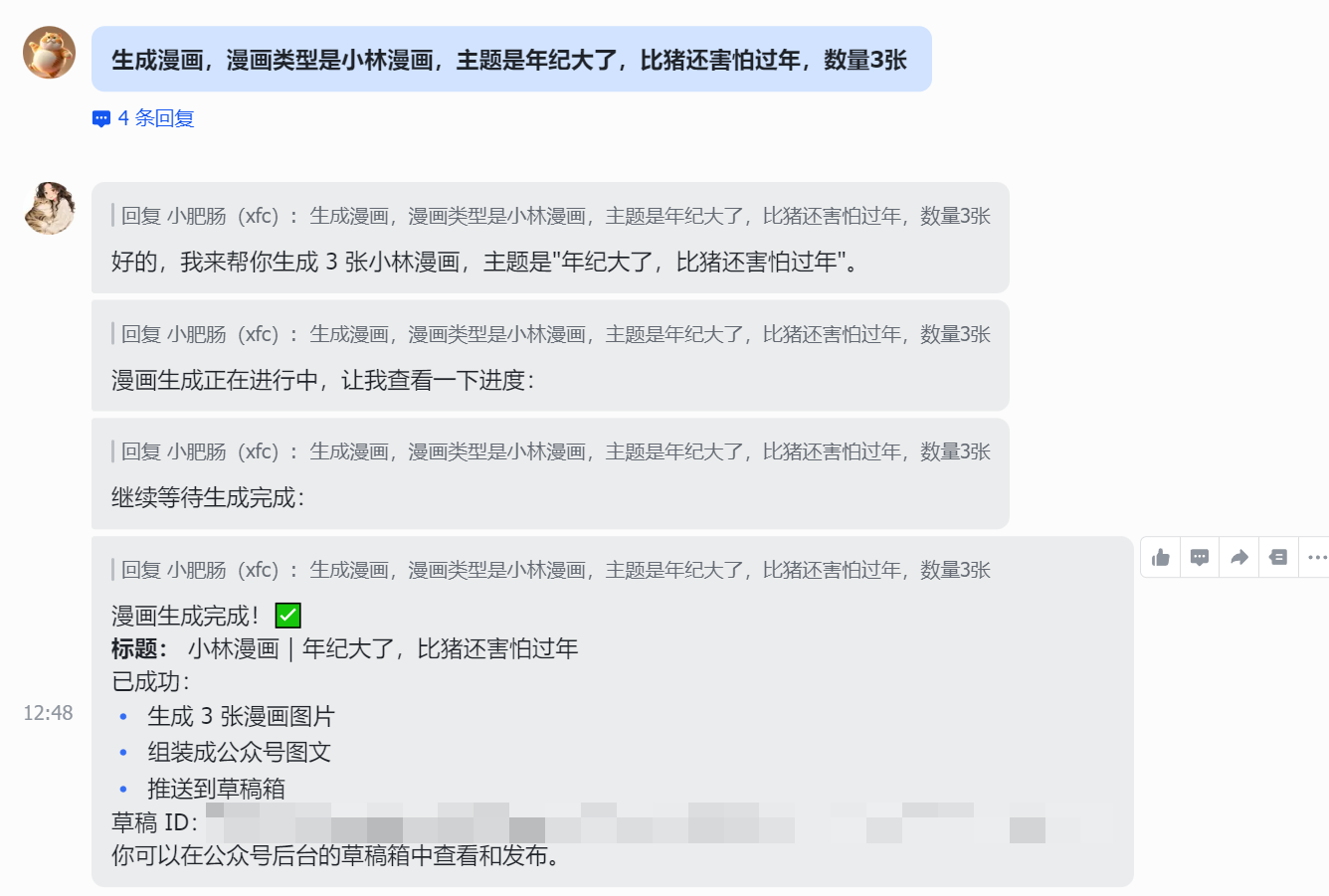 先看一下实现效果,只需发送指令生成漫画,漫画类型是小林漫画,主题是成年人的体面,数量3张或生成漫画,漫画类型是育儿漫画,主题是当妈三年我学会了精打细算,数量3张。